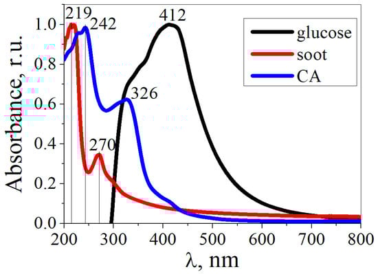 Figure 8 shows the absorption spectra of the CDs obtained from CA, glucose, and soot. The absorption spectra of the CDs from CA and soot differed from those of the CDs from glucose. The CDs from CA exhibited absorption bands at 242 nm and 326 nm, which were assigned to the π→π* transition of sp2 aromatic domains and to the n→π* transition of the C=O bond, respectively [43,44]. The absorption band at 412 nm in the CDs from the glucose can be attributed to the n→π* transitions of functional groups on the surface of the CDs. For CDs from soot, the absorption bands in the region from 200 to 290 nm are assigned to π→π* transitions in the C=C bonds of the sp2 plane [45].