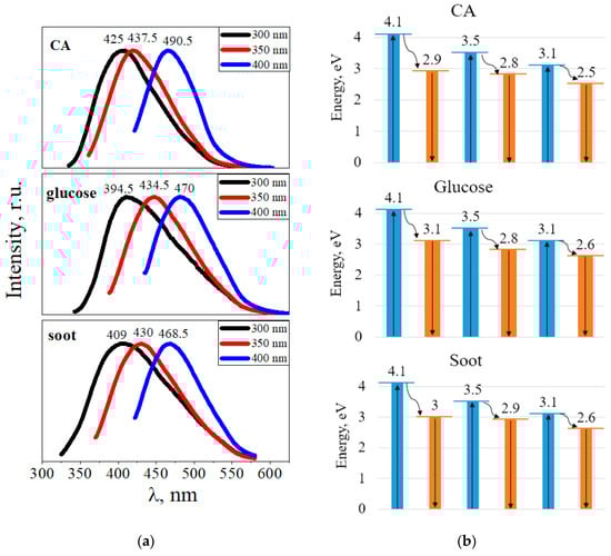 All CDs synthesized using the hydrothermal method exhibited bright luminescence in the blue-green region of the spectrum. Figure 9a shows the luminescence spectra of the CDs from CA, glucose, and soot depending on the excitation wavelength. When the excitation wavelength changes from 300 to 400 nm, the luminescence peaks shift to the long-wavelength region of the spectrum. For example, upon excitation at a wavelength of 300 nm, CDs from CA luminesce at 425 nm (2.9 eV), glucose at 394.5 nm (3.1 eV), and soot at 409 nm (3.0 eV). Moreover, when excited at a wavelength of 400 nm, CDs from CA luminesce at 490.5 nm (2.5 eV), CDs from glucose at 470 nm (2.6 eV), and CDs from soot at 468.5 nm (2.5 eV).