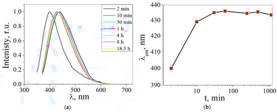 The influence of the synthesis time on the luminescence peaks of the CDs synthesized from glucose was determined. Figure 10a shows the luminescence spectra of the CDs obtained from glucose at different synthesis times. It is shown that CDs’ luminescence is at a wavelength of approximately 400 nm at synthesis times from 2 min, while at times from 10 min up to 18.5 h, the CDs’ luminescence is in the region of ~430–435 nm. It has been suggested that during synthesis with a duration of 2 min in a CD solution, one type of luminescence center is formed with a peak at approximately 400 nm, while during synthesis with a duration of 30 min to 18.5 h it is transformed into the second type of luminescence center.