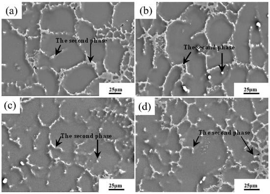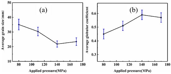 - With the increase in pressure from 80 MPa to 140 MPa, the microstructure of near-liquidus squeeze casting AZ91D alloy gradually evolves from rose-like crystals to spherical crystals, and the average grain size is refined from 35.07 μm to 21.83 μm, and the average spherical coefficient increases from 0.45 to 0.59. The pressure simultaneously reduces the content of the second phase β-Mg17Al12 within the alloy so that it gradually transforms from a coarse aggregated state to a fine homogeneous state.