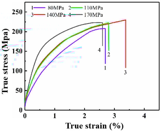- With the increase in pressure from 80 MPa to 140 MPa, the tensile strength increases from 209.4 MPa to 229.2 MPa, and the elongation increases from 2.70% to 3.43%. When the pressure exceeded 140 MPa, the pressure had little effect on the microstructure and mechanical properties of the alloy, but the grain size was coarsened, and the mechanical properties were decreased.