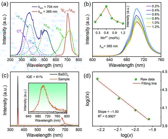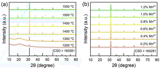- Zhou, C.; Zhang, Y.; Zhu, J.; Ren, X.; Zhu, Y.; Yin, P.; Zhao, L.; Wang, J.; Feng, X. Enhanced luminescence performances of BaLaMgTaO6:Mn4+ red phosphor by Bi3+, Ca2+ doping for indoor plant lighting supplementary LED. Spectrochim. Acta A 2022, 268, 120655. [Google Scholar] [CrossRef]