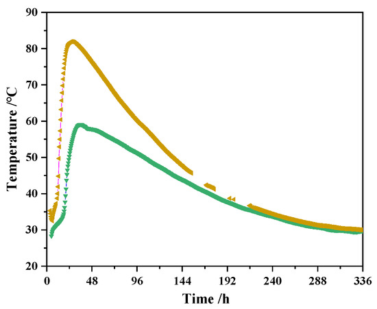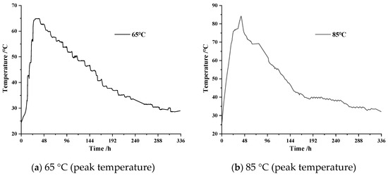 The temperature simulation process was as follows: the temperature change process of concrete was broken down into several small temperature change stages. Additionally, the temperature was adjusted every 4 h during the heating phase until it increased to the maximum temperature; the temperature was adjusted every 8 h during the cooling phase until it dropped to an ambient temperature. The heating and cooling rate of the temperature was determined according to the concrete temperature data measured in the engineering. Figure 1 shows the temperature variation process inside two groups of concrete walls that were measured in a C50 mass concrete engineering project. As can be seen from Figure 1, the internal temperature of concrete reached its maximum value around 24–48 h (taking its time when concrete began to be poured as the initial zero point), and the internal temperature of concrete was basically consistent with the ambient temperature at 14 d, i.e., the cooling process was basically over. The simulation of the temperature variation process in this study was based on the temperature variation in the data of mass concrete obtained from engineering practice (as shown in Figure 1), and Figure 2 shows the variable temperature curing environment with peak temperatures at 65 °C and 85 °C, which were simulated by a curing box based on the temperature change data obtained in engineering practice.