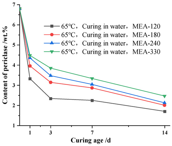 In this section, the effect of the curing temperature on MgO hydration in cement paste was studied. The cement paste was prepared according to the raw material ratio of “system a” in Table 2. Figure 3 shows the hydration process of MgO when mixed with four types of MEA cement paste under a 65 °C variable temperature with water curing conditions. It can be seen from Figure 3 that the changes in the MgO content in the cement paste mixed with four types of MEA generally showed a trend of first fast and then slow. The hydration rate of MgO in the cement paste was the fastest before 1 d, and then the hydration rate of MgO in the cement paste began to gradually slow down. When the curing age was 1 d, the content of MgO in the cement paste mixed with MEA-120, MEA-180, MEA-240 and MEA-330 was reduced by 3.48 wt.%, 2.85 wt.%, 2.45 wt.% and 2.33 wt.%, respectively. In contrast, the content of MgO in the cement paste mixed with MEA-120, MEA-180, MEA-240 and MEA-330 was reduced by 0.99 wt.%, 0.81 wt.%, 0.88 wt.% and 0.63 wt.% at the curing age from 1 d to 3 d, respectively. In addition, the higher the activity of MEA, the faster the hydration at the early stage, and the lower MgO remained in the cement paste during the cooling stage. The cement pastes with MEA-120 had the lowest residual MgO content throughout the process, while the cement paste with MEA-330 had the highest residual MgO content throughout the process. The residual MgO content of the cement paste with the other two activities always lay between them.