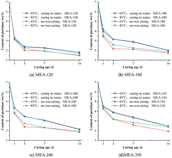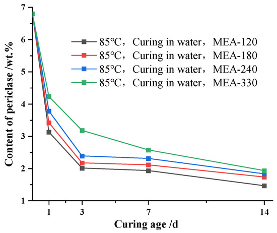 Figure 5 shows the comparison of the remaining MgO content of the cement paste mixed with the same active MEA at 65 °C and 85 °C under variable temperature water curing conditions. By comparison, it was found that the residual content of MgO in the cement paste mixed with MEA-120, MEA-180, MEA-240 and MEA-330 at the curing age of 1 d under an 85 °C variable temperature and the water curing condition is reduced by 0.2 wt.%, 0.54 wt.%, 0.57 wt.% and 0.24 wt.%, respectively, compared with that under a 65 °C variable temperature water curing condition. Moreover, the MgO content in the cement paste mixed with MEA-120 under a 65 °C variable temperature water curing condition and MEA-120, MEA-180 and MEA-240 under an 85 °C variable temperature water curing condition showed a “plateau period” during the cooling stage (3–14 d). This was not significantly observed for other cement pastes when mixed with other active MEAs under the same curing condition. In comparison, it was found that the MgO content in the cement paste of these four groups started to show signs of a “plateau” mostly at the age of 3 d (i.e., the cooling stage). At this time, the MgO content in the cement paste was mixed with MEA-120 under a 65 °C variable temperature water curing condition, MEA-120, MEA-180 and MEA-240 was under an 85 °C variable temperature water curing condition and were 2.33 wt.%, 2.01 wt.%, 2.17 wt.% and 2.38 wt.%, respectively. The other four groups of cement pastes without this situation had a higher MgO content at a curing age of 3 d compared to the MgO content values at the time of plateauing. In addition, it could also be found that the increase in the curing temperature had a slightly different effect on the promotion of the hydration reaction of different active MEAs. The low activity of MEA seemed to be more sensitive to the temperature, and the increase in the temperature was more effective when promoting the hydration of low-activity MEA. This may also be due to the rapid reaction of the highly reactive MEA, resulting in a premature approach to the “plateau content” of MgO in the cement paste mixed with a highly reactive MEA.