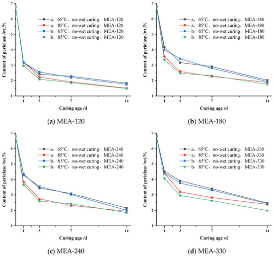 In order to clarify the effect of the cementitious system on MgO hydration in the cement paste under variable temperatures and non-wet curing conditions, the hydration of MgO in the cement paste was formed according to the cementitious system a and b was compared. Figure 7 shows the comparison of the MgO residual content in cement paste mixed with the same active MEA under the condition of variable temperature and non-wet curing at 65 °C and 85 °C.