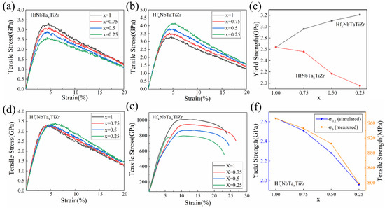 - The atomic ratios of Hf and Ta elements were adjusted synchronously, and their effects on the performance of HEA were simulated. The results show that as the ratio of the two elements decreases, the yield strength and elastic modulus of HEA decrease. A small amount of as-cast HEA samples with the same composition were prepared and tested. The variation trend of properties obtained by the test is consistent with the MD simulation results which further confirms the reference value of the MD simulation results.