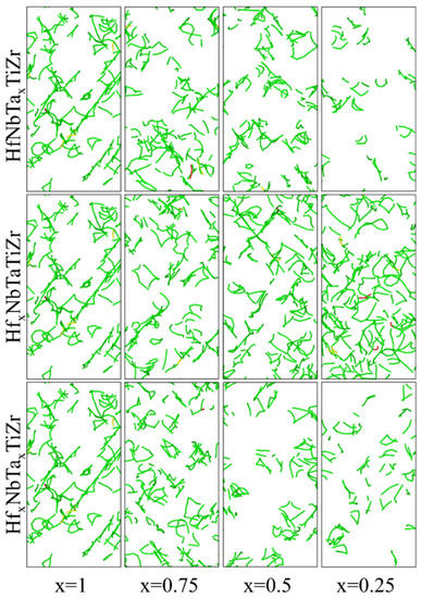 - Through MD simulation, it is found that the strength of HEA decreases with the decrease of Ta content, while increases with the decrease of Hf content. This result is consistent with the experimental results of the existing research. The reliability of the simulation results has been preliminarily confirmed.