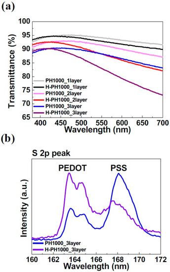The optical characteristics of the PH1000 and H-PH1000 films are shown in Figure 1a. The transmittance of one-, two-, and three-layer PH1000s were 94.14%, 91.40%, and 88.22% at 550 nm, as measured by UV-visible spectroscopy. Sarker et al. reported an increase in conductivity when hydroiodic acid treatment was applied to multi-layered PH1000 [18]. However, since the Cas of PH1000 droplets on one-, two-, and three-layer PH1000 films were 41°, 49°, and 57°, stacking more than three layers of PH1000 was difficult, as shown in Figure S2. When treated with sulfuric acid, the transmittance values of one-, two-, and three-layer H-PH1000s were 92.82%, 88.19%, and 82.94%, and it was observed that the transmittance values decreased. This is because, when treated with sulfuric acid, recrystallized PH1000 becomes metallic and shows a higher reflectance [17,32]. It is worth noting that the three-layer H-PH1000 film still maintained a semi-transparent property despite the decrease in transmittance.