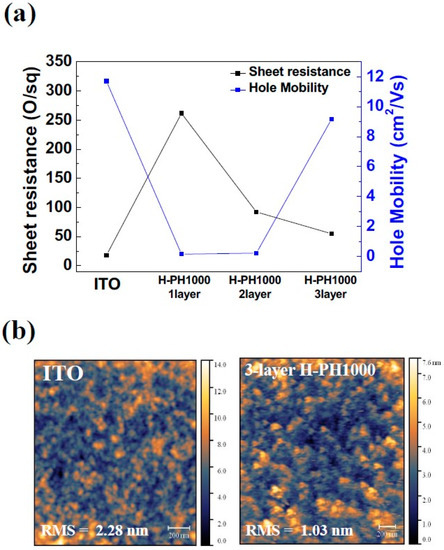 (a) Comparison of electrical characteristics between H-PH1000 and ITO electrodes. (b) AFM images of 3-layer H-PH1000 and ITO films.