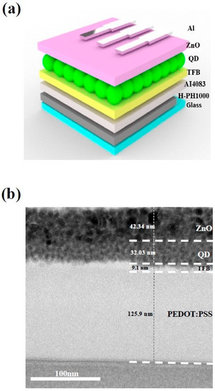 (a) Schematic structure of QLEDs with an H-PH1000 electrode. (b) Cross-sectional HR-TEM image of a 3-layer H-PH1000 QLED.