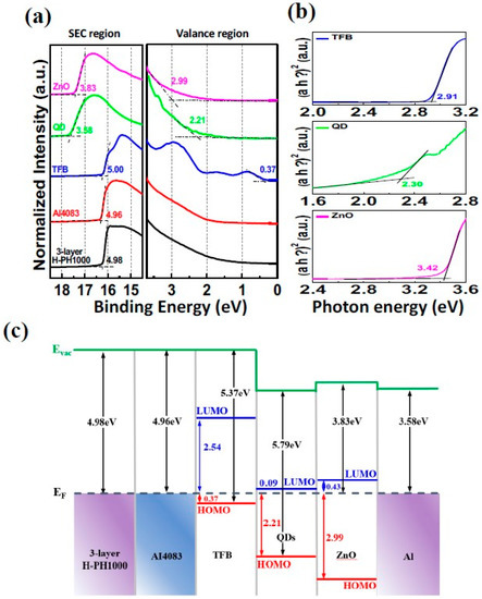 (a) SEC (left) and valence (right) region spectra of 3-layer H-PH1000, 3-layer H-PH1000/AI483, 3-layer H-PH1000/AI483/TFB, 3-layer H-PH1000/AI483/TFB/QDs, 3-layer H-PH1000/AI483/TFB/QDs/ZnO. (b) Optical bandgaps of TFB, QDs, and ZnO. (c) Interfacial energy-level diagram of QLED with H-PH1000 electrode.