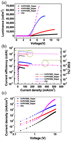 To confirm the EL performances, the hole-only devices (HODs) were fabricated with device structures of bare glass/one-, two-, and three-layer H-PH1000 and ITO/AI4083/TFB/Al. Figure 5c shows the current density (J–V) characteristics of the HODs. In the low voltage range, two- and three-layer H-PH1000 QLEDs exhibit higher current density values compared to ITO due to band alignment, despite having higher resistance. However, as the voltage increases, the electrode’s resistance becomes the dominant factor, leading to higher current flow. The relation between the electrodes’ sheet resistance and charge transfer properties for QLEDs is consistent with HODs.