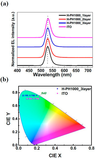 The EL spectra at the maximum luminance of each device are exhibited in Figure 6a. All QLEDs exhibit EL peaks with a high color purity and full width half maximum value of approximately 25 nm. As shown in Figure 6b, the CIE1931 (x,y) coordinates with three-layer H-PH1000 and ITO QLEDs were measured as (0.199, 0.758) and (0.204, 0.756). The EL peak of the ITO QLED appears to be blue-shifted compared to H-PH1000, possibly due to the Joule heat generated by the high current density [47]. The use of H-PH1000 as an electrode with a high work function offers a promising solution to improve the hole injection characteristics in QLEDs, ultimately resulting in the fabrication of high-efficiency QLEDs.