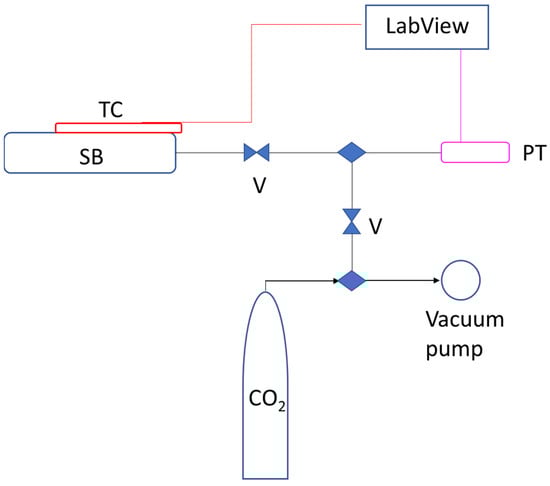 The experimental setup used for the accelerated carbonation was described in detail in a recent publication [] and is illustrated in Figure 1. The setup was constructed of durable, stainless steel components made from either AISI 304 or 316L. The sample was manually loaded into a 150 mL volume sample barrel (SB) using a pipette and then connected via a needle valve (V) to a precision pressure transducer (PT), which continuously recorded gas pressure values with an accuracy of 0.5%. These pressure values were collected at a rate of 100 samples per second. The temperature outside the barrel was monitored using a thermocouple (TC) placed on the outer wall of the barrel. Pressure and temperature data were collected using LabVIEW data acquisition software and were recorded every 5 s. Before the carbonation process began, the barrel was evacuated of excess air using a vacuum pump. Once the CO2 injection began and the pressure reached 15 bar, the valve was closed to isolate the system. Throughout the entire process, including preparation, loading, and carbonation, the loaded sample, CO2, and final setup were weighed using an electronic scale with an accuracy of 0.1 g. The barrel and the circuit were weighed before and after carbonation to ensure the system remained isolated. If the difference between the total initial mass and the final mass was zero, the system was confirmed as closed. Once the carbonation reaction was complete, the setup was disassembled, and each component was cleaned with acetone to remove all solid or liquid impurities. Prior to conducting the tests, a leak test was performed by charging the circuit with helium at a pressure of approximately 20 bar and room temperature for 48 h.