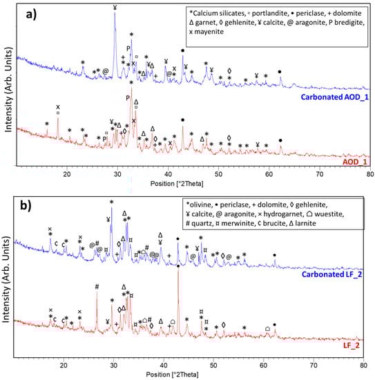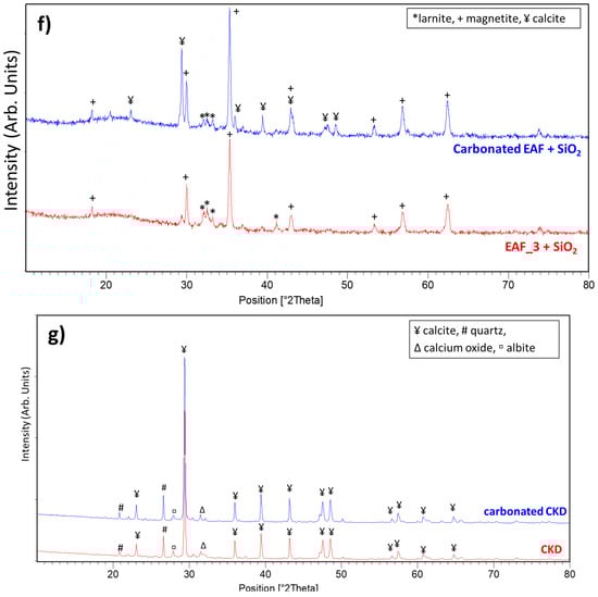 XRD spectra of steel slags and related carbonated products: (a) AOD_1 and carbonated AOD_1; (b) LF_2 and carbonated LF_2; (c) EAF_1 and carbonated EAF_1; (d) EAF_2 and carbonated EAF_2; (e) EAF_2 + SiO2 and carbonated EAF_2 + SiO2; (f) EAF_3 + SiO2 and carbonated EAF_3 + SiO2; (g) CKD and carbonated CKD. The reference codes of the mineralogical phases are presented in Table A1.