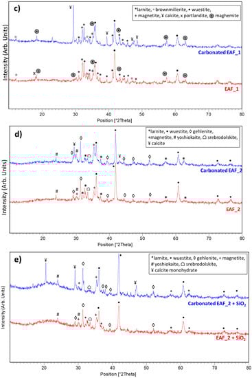 The XRD analysis results of the steel slags and carbonated products are presented in Figure 2. The AOD_1 slag and LF_2 slag had similar main phases, including periclase (MgO), gehlenite (Ca2Al(AlSi)O7), and dicalcium silicate. The presence of silicates was also found in the IR spectrum (Figures S4 and S5 in Supplementary Materials): silicates have vibrations in the region of 1200–800 cm−1 due to symmetric stretching vibrations of Si-O bonds. Peaks in this range are given by β-C2S, γ-C2S, merwinite, and bredigite []. For the EAF_1 slag, the main phases were larnite (Ca2SiO4), wuestite (FeO), maghemite (Fe2O3), and brownmillerite (4CaO·Al2O3·Fe2O3). The main phases for EAF_2 were gehlenite (Ca2Al(AlSi)O7), wuestite (FeO), magnetite (Fe3O4), and larnite (Ca2SiO4), as confirmed by the XRD patterns in Figure 2c,d. These two last phases were the main constituent for EAF_3, as shown in Figure 2e. For this last material, IR analysis confirmed the identified mineralogical phases: β-C2S has a vibration band at 805 cm−1, amorphous silica has a stretching bond at 1111 cm−1, and the carbonate ion has a bending vibration at 871 cm−1 and a stretching vibration at 1469 cm−1 (see the Supplementary Materials, Figure S6). These findings are consistent with previously reported data in the literature [,,,].