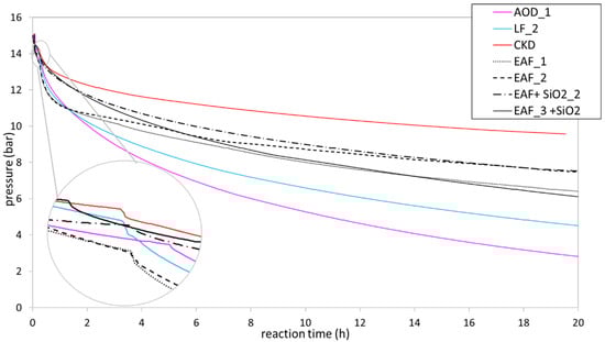 The pressure trend during the reaction was studied by collecting data at different time intervals. Figure 3 presents the pressure data collected for a reaction time of 20 h. All data were collected for 24 h, except for CKD, which was limited to 20 h due to external factors (the data present in Table 2 is related to the pressure after 24 h). The pressure decreased in all cases but in different ways due to the reactivity of the starting material. Generally, after 24 h, the pressure tended to decrease, slowly stabilizing at the values reported in Table 2. In the cases of AOD and LF, the pressure value was low, indicating the nearly complete reaction of CO2, whereas, for EAF and CKD, the values were higher, probably due to the absence of free Ca ions in the solution or a slower reaction rate between the slurry and the gas. It is worth noting that a small “jump” in the pressure trend was observed in the grey circle. This was due to the change in the position of the setup from a vertical to a horizontal orientation, which increased the contact surface between the slurry and the gas.