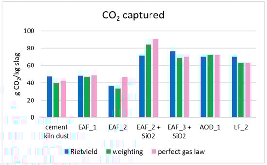 The Rietveld method is commonly used to calculate the amount of captured CO2. However, due to the complex XRD spectra of slags, which are characterized by a high background (fluorescence effect of iron) in EAF slags and many mineralogical phases not being well separated in LF/AOD slags, three methods were used to calculate the CO2 sequestered, as described in Section 2.4 The data about the amount of CO2 sequestered are presented in Figure 4. While the three methods showed a correlation in results, some differences were observed. For instance, EAF_2 contained a high percentage of Fe2O3, which can cause rapid separation of the slurry. During the sample charging process, the mass of water could be larger, leading to CO2 being only diluted in water but not adsorbed by the sample, resulting in an overestimation of CO2 sequestered. Moreover, for CKD, EAF_3, and LF_2, the overestimation of CO2 sequestered by the Rietveld method may have been due to the lack of identification of matching mineralogical phases.