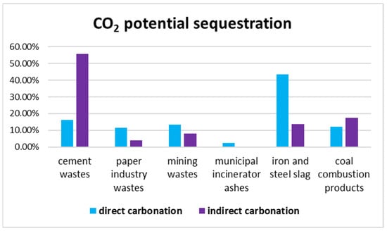 The industrial sequestration potential of CKD and steel slag was estimated based on the obtained and theoretical values of the captured CO2. CKD production typically results in 54–200 kg of waste per ton of cement clinker []. Assuming a production of 1 ton of CKD, the potential CO2 capture ranges from 48 kg to 55 kg, considering the obtained and theoretical values, respectively. On the other hand, steel slag contains several free Ca-phases that can react with CO2, and it was estimated that the proposed method could sequester 124–240 kg CO2 per ton of slag based on the average experimental and theoretical values of sequestered carbon dioxide calculated previously, whereas they can sequester 513 kg CO2 for 1 ton of slag if the average %CaO was considered. The direct carbonation process of steel slag can be more efficient than CKD because of the higher availability of free Ca phases. However, the CKD could be more effective in an indirect route that optimizes Ca leaching through a solvent, as shown also in Figure 5 [,,]. The indirect route was carried out in two separate steps: the leaching of Ca2+ and Mg2+ ions from wastes using chemical solvents (sulfuric acid, hydrochloric acid, sodium hydroxide, ammonium hydroxide, etc.) and the reaction between lixiviate material and CO2. The choice of extraction conditions is fundamental in this method and, in general, acid solvents are used for Ca2+ ions extraction, whereas basic solvents are used for Mg2+ ions [,,].