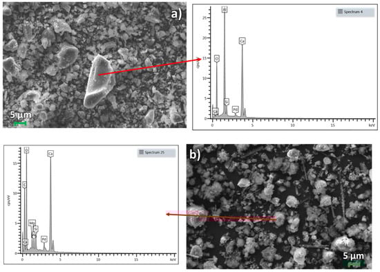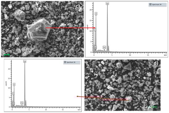 We conducted SEM analyses on the best-performing steel slag (EAF_3 + SiO2, AOD_1, and LF_2) and CKD. Only AOD_1 slag showed visible differences between the starting material and the carbonated product. The steel slag before carbonation was homogeneous and contained different crystals of Ca2SiO4, gehlenite (Ca2Al(AlSi)O7), or garnet, as shown in Figure 6a. In AOD_1, calcite was irregularly crystallized, growing on Ca-phase crystal surfaces, as shown in Figure 6b. The long needles present in the AOD_1 carbonated sample were attributed to the hydration of calcium silicate, where calcium carbonate particles formed on the surface, in accordance with the chemical analysis (Figure S1 in the Supplementary Materials) []. In LF_2, CaCO3 was present as calcite and aragonite, which were long needles (see the Supplementary Materials, Figure S1), as confirmed by the XRD pattern (Figure 2b) [,,,,]. In EAF_3 + SiO2, the starting material was not homogeneous, with three phases being distinguished: amorphous silica, which was present as small circular particles and a pile, and slag as crystals (see the Supplementary Materials, Figure S2). After carbonation, the sample was more homogeneous, with visible calcite crystals growing on Ca2SiO4 particles (see the Supplementary Materials, Figure S3). The CKD showed calcite as the main phase, with interesting small crystals of CaCO3 growing differently from the initial crystal of calcite due to the absence of control of particle growth of the interested product (Figure 6c,d) [].