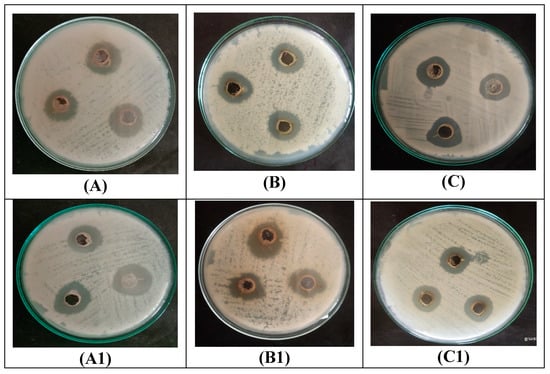 Antibacterial activity of synthesized AgNPs is presented while the illustration presents antibacterial activity of CP-AgNPs against Bacillus subtilis (A), Bacillus megaterium (B), and Shigella flexneri (C). Similarly, the antibiotic (Penicillin) was tested as a positive control against Bacillus subtilis (A1), Bacillus megaterium (B1), and Shigella flexneri (C1). Moreover, the antifungal activity of CP-AgNPs against Aspergillus niger (D), penicillium crysogenum (E), and Trichoderma viride (F), while antibiotic Fluconazole was tested as a positive control against Aspergillus niger (D1), penicillium crysogenum (E1), and Trichoderma viride (F1).