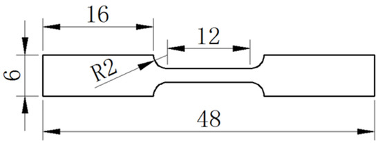 The tensile properties were tested by a mechanical testing machine (CMT-5205, SANS, Shenzhen, China) at room temperature at a constant strain rate of 3 × 10−3 s−1. As shown in Figure 1, dog-bone-shaped tensile specimens with a gauge dimension of 12 × 3 × 2 mm3 were cut from the as-cast ingots. In this paper, the effects of the addition of Sb, In, Ni, and Bi on the tensile strength, yield strength, and elongation of solder alloys were studied. To ensure repeatability, at least 3 specimens were tested for each alloy component. The tensile fracture morphologies were examined by scanning electron microscope (SEM, Zeiss Sigma 500, Jena, Germany).