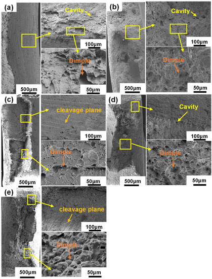 The fracture morphologies of SAC105-2Sb-4.4In-(0.3 − x)Ni-xBi solder alloys after the uniaxial tensile test were examined using SEM, as shown in Figure 3. Ductile dimples and pores are the main features that appear on the fracture surfaces of SAC samples, which is consistent with the good toughness of SAC solder alloys [42]. With the increase in Bi, cleavage surface and cleavage step appear on the fracture surfaces of the solder alloys with a few pits and cracks, indicating that the plasticity of the solder alloys decreases gradually. From Figure 3b–e, the range of the cleavage plane gradually increases, which is caused by the nucleation and expansion of cracks along the cleavage plane generated during the fracture of the alloy [43]. The decrease in dimple size is consistent with the increase in UTS and YS of the solder alloys and the decrease in elongation in the tensile test. Figure 3d shows the fracture morphology of SAC105-2Sb-4.4In-0.1Ni-0.2Bi solder alloy. A large number of cleavage steps, more holes, and smaller dimple size appear in the fracture, indicating increased brittleness, which is consistent with tensile properties in Figure 2, i.e., an increase in strength and a decrease in elongation. Figure 3e shows the fracture morphology of SAC105-2Sb-4.4In-0.3Bi solder alloy, which is composed of a cleavage plane, dimples, and several large holes, and the dimple size is further reduced, implying that the fracture mechanism is a combination of ductile fracture and brittle fracture.