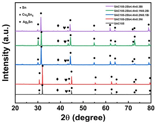 XRD was conducted to identify the phase structures of SAC105 and SAC105-2Sb-4.4In-(0.3 − x)Ni-xBi solders and the corresponding patterns are shown in Figure 4. It can be seen that all alloys consist of three main phases: the β-Sn phase, the Cu6Sn5 phase, and the Ag3Sn phase. No evident peaks were detected for Ag3Sn due to its low content. It is worth noting that when Bi is introduced into SAC105 alloy, the XRD peaks shift to the left, which may be attributed to the lattice distortion caused by Bi atoms being able to integrate into the Sn matrix. However, due to the low content of compounds containing Sb, In, Ni, and Bi, their existence cannot be detected from XRD patterns.