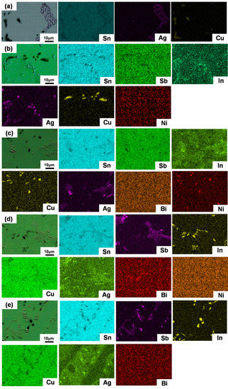 EDS elemental mapping of the solder alloys. (a) SAC105, (b) SAC105-2Sb-4.4In-0.3Ni, (c) SAC105-2Sb-4.4In-0.2Ni-0.1Bi, (d) SAC105-2Sb-4.4In-0.1Ni-0.2Bi, and (e) SAC105-2Sb-4.4In-0.3Bi.
