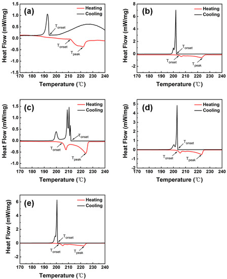 DSC curves of solders with different components. (a) SAC105, (b) SAC105-2Sb-4.4In-0.3Ni, (c) SAC105-2Sb-4.4In-0.2Ni-0.1Bi, (d) SAC105-2Sb-4.4In-0.1Ni-0.2Bi, and (e) SAC105-2Sb-4.4In-0.3Bi.
