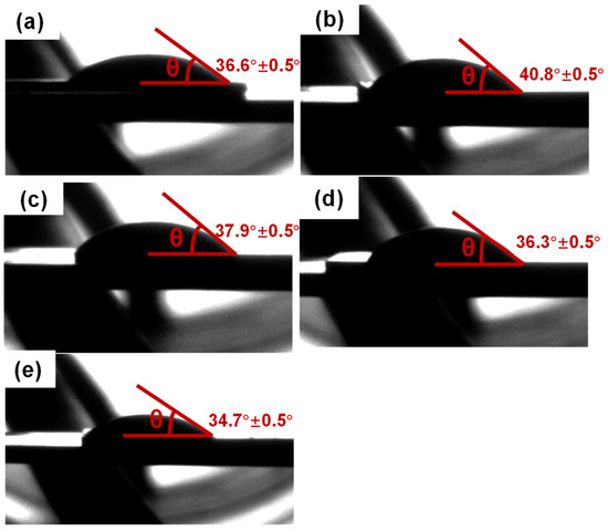 Measurement of contact angles of the solder alloys with different components. (a) SAC105, (b) SAC105-2Sb-4.4In-0.3Ni, (c) SAC105-2Sb-4.4In-0.2Ni-0.1Bi, (d) SAC105-2Sb-4.4In-0.1Ni-0.2Bi, and (e) SAC105-2Sb-4.4In-0.3Bi.