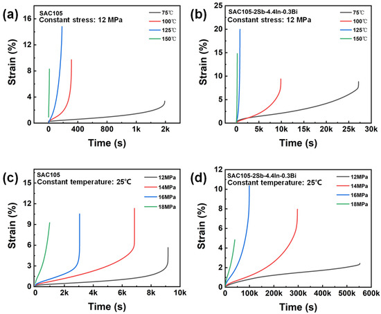 Comparison of creep curves of SAC105 and SAC105-2Sb-4.4In-0.3Bi at different temperatures under a constant tensile stress of 12 MPa (a,b) and different applied stresses at a constant temperature of 25 °C (c,d).