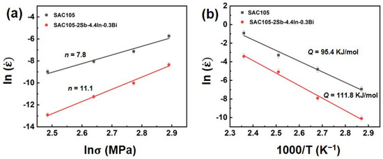(a) Relationship between ln (σ) and ln () at room temperature, and (b) temperature dependence of steady-state creep rate of SAC105 and SAC105-2Sb-4.4In-0.3Bi solder alloys.