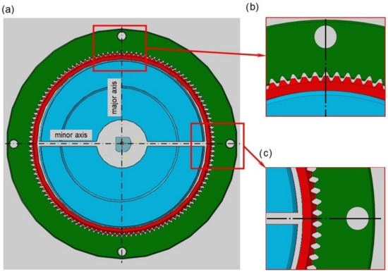 Model of the harmonic drive prepared for FEM calculations: (a) general view, (b) enlargement of the meshing area in a major axis, (c) enlargement of the model region in a minor axis.