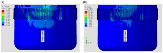 Numerical calculations carried out in the Abaqus program allowed obtaining an extensive range of results. The results on the distribution of the reduced stresses are shown in Figure 3.