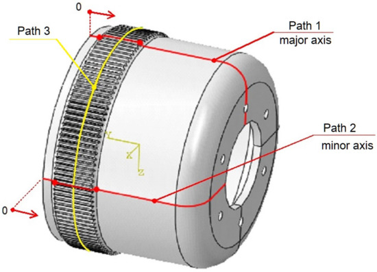 To more accurately compare the stresses present in the model, their values read along the paths defined on the flexspline model were compared. To do this, the Path function in the Abaqus Visualization module was used. The paths were defined by all nodes of the finite element mesh, lying in the major and minor axes of the generator, as shown in Figure 6. This figure also presents the location of path 3, the use of which is described later in this article.