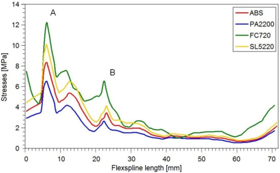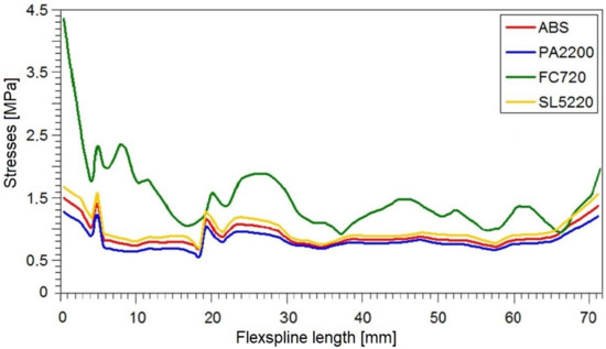 In this way, the values on the abscissa axis (x) were also determined in the stress diagrams created shown in Figure 7 and Figure 8. It is clear that for all variants of the material analyzed, the stress distribution on the flexspline has a similar form. The highest values are found at the edge of the toothed wheel rim, located at the end of the flexible sleeve, which is marked in Figure 6 as “A”. This shape of the graph is strongly influenced by surface pressures resulting from the meshing of the teeth of both gear wheels. Another area of higher values was located in the place marked with “B”. In this area, the local increase in stress is caused by a change in the thickness of the flexspline between the toothed wheel rim and the thinner sleeve body. For all the analyzed materials, the highest values occurred in the case of FullCure720 slightly lower for the second resin. The stresses for ABS were about 30% lower, and the lowest were read for polyamide, and they accounted for about half the magnitude obtained for resin.