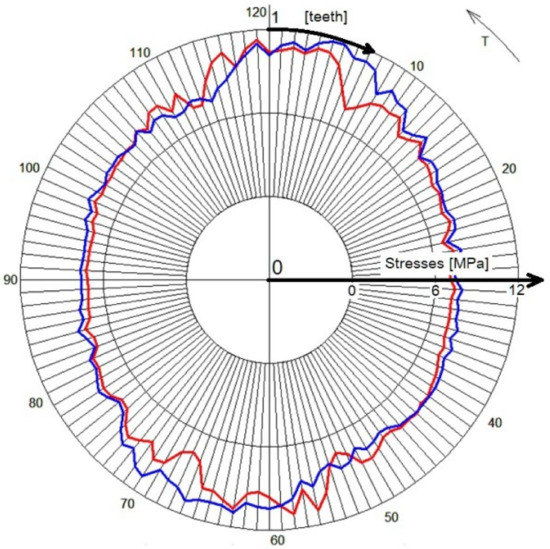 In Figure 10, red is used for the toothed wheel rim deformed by the generator, while blue is used for the stresses after the model is loaded by torque. For a flexspline only deformed by a wave generator, the graph is symmetric about the main axes of them. The torque added to the harmonic drive causes the area of higher stresses to shift in the direction opposite to the operation of the load. According to recommendations from the literature [11,22,23] in analytical calculations for the next teeth located directly in the meshing area, the forces values are determined proportionally. Stresses are not evenly distributed, so the approximate determination of the value of the forces that load the teeth does not correspond to the real working conditions. It is therefore necessary to use advanced calculation methods such as FEM which allow one to determine the deformation of the flexspline to be very precise.