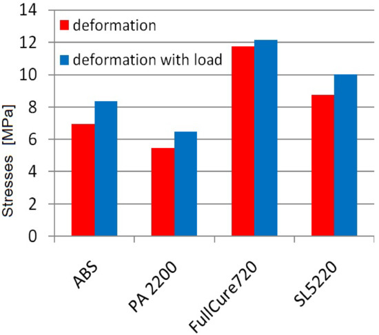 The stresses did not reach a level that could damage the components on any of the test materials. By comparing the calculated maximum stresses with the tensile strength given in Table 1, it is possible to check which strength reserve was obtained for each of the materials. For the polymer PA2200, the lowest effort level was obtained, and in this case, the stresses were the lowest. The next wasSL5220 resin and ABS, and the most intense effort has proved the element made of FullCure720 resin. This corresponds to the gradation of the maximum values read on the basis of FEM calculations and depends mainly on the properties of the tested materials.