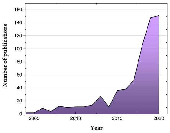 Publication trend (2000–2020) in the application of green nanomaterials for smart textiles (Source of raw data: ISI Web of Science; search keywords: “Green nanomaterials for smart textiles to environmental and biomedical applications”).