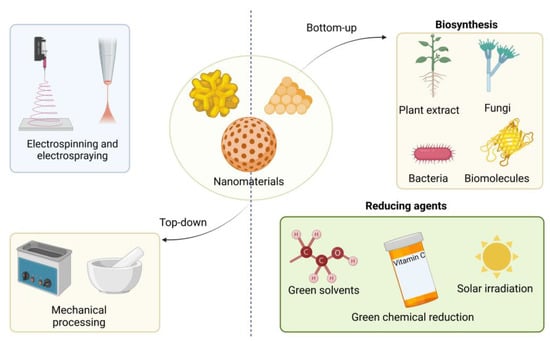 The top-down and bottom-up green synthesis methods of nanomaterials. (the graphical illustration has been created with BioRender software (https://www.biorender.com/about)—BioRender Company, Toronto, ON, Canada).