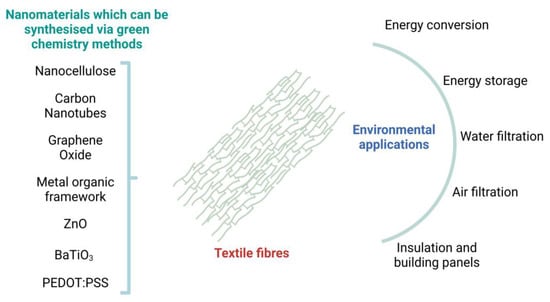 Nanomaterials which can be synthesised via green chemistry and potential environmental applications of the textile fibres incorporating green nanomaterials. (the graphical illustration has been created with BioRender software (https://www.biorender.com/about)—BioRender Company, Toronto, ON, Canada).