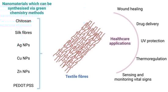 Nanomaterials which can be synthesised via green chemistry and potential healthcare applications of the textile fibres incorporating green nanomaterials. (the graphical illustration has been created with BioRender software (https://www.biorender.com/about)—BioRender Company, Toronto, ON, Canada).