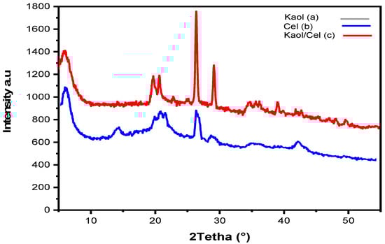 XRD patterns of initial cellulose are shown in Figure 2a–c. For the XRD pattern of kaolinite (a), the well-known diffraction peaks at 2θ around 6.0°, 19.6°, 20.8° 26.5°and 29.3° were attributed to the planes of (110), (002), (020) and (021), respectively, all of which were in agreement with the different characteristic orientation of the layers in the crystal structure of kaolinite (Kaol) [19]. For the XRD pattern of cellulose (b), the peaks observed at 2θ around 5.7°, 14.1°, 20.8°, 27.0°, and 29.0° are attributed to the (101), (10-1), (002), (110), and (10-2) planes, respectively, in the cellulose structure. These peak positions represent the interplanar spacing and arrangement of the cellulose chains [40]. The XRD pattern of the Kaol/Cel–25 composite(c) shows a significant decrease in peak intensities compared to the individual kaolin and cellulose patterns. This decrease in density is due to integrating the cellulose molecules into the clay framework. In addition, this work provided further evidence that Kaol particles may be successfully synthesized in the Kaol/Cel–25 formulation [19,40].
