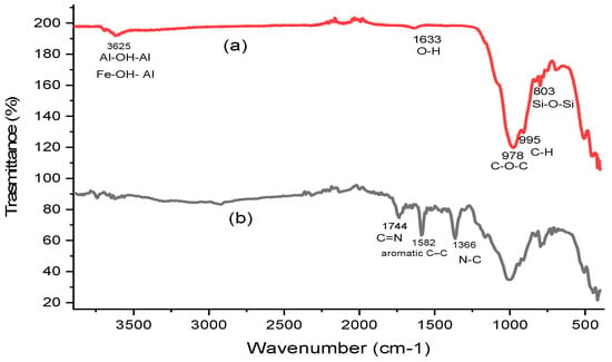 FT-IR analysis was employed to compare the functional groups on the surface of Kaol/Cel–25 before and after CV adsorption, as illustrated in Figure 3a,b, respectively. The FT-IR spectra of Kaol/Cel–25 before CV adsorption (Figure 3a) showed bands at 1633 cm−1, which could be attributed to O-H stretching and coordinated water bending vibrations, respectively [16,41]. The Si-O-Si stretching vibrations of kaolinite or quartz cause the peak at 803 cm−1, whereas the peaks at 3625 cm−1 are caused by Al-OH-Al and Fe-OH-Al deformation. The spectrum of the utilized cellulose was utilized to determine the various chemical groups of cellulose, such as β-glycosidic linkages at approximately 987 cm−1, -C-O-C pyranose rings at around 1630 cm−1, -C-H groups at around 995 cm−1 as well as approximately 2157 cm−1 [42]. The FT-IR spectrum of Kaol/Cel–25 after CV dye adsorption (Figure 3b) displayed the same bands in the spectrum before, with a slight shifting of some bands, indicating the involvement of the functional groups of Kaol in the adsorption of CV dye. Moreover, a new band that appeared at the approximately 1744 cm−1 band is attributed to the elongation of the C=N bond. The 1582 cm−1 band is due to aromatic C–C stretches, while the vibration of aromatic tertiary amine N–C is observed at 1366 cm−1, indicating that the important functional groups of Kaol/Cel–25 were responsible for the adsorption of CV dye [43].
