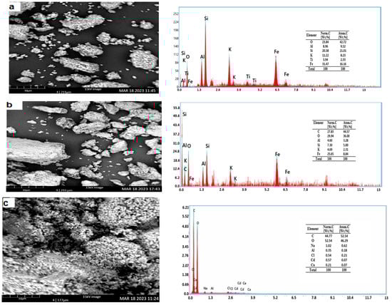 Scanning electron microscopy (SEM) and energy-dispersive X-ray (EDX) spectrum of (a) Kaol, (b) Kaol/Cel–25, and (c) Kaol/Ce–25 after CV dye adsorption.