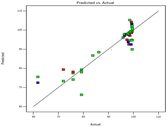 A positive sign in Equation (4) indicates that the factor has a synergistic impact, while a negative sign means that the factor has an antagonistic effect [44]. As shown in Figure 5, the R-squared (determination coefficient) for the response factors is 0.97, which is a very high number indicating an excellent correlation between the real and projected values.