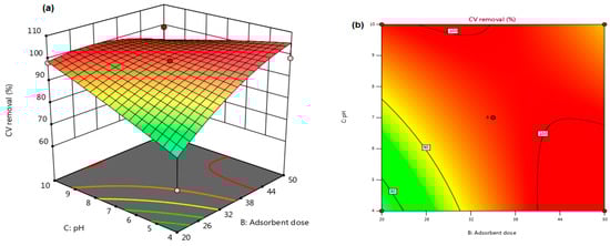 The influence of the adsorbent dose (B) and the solution pH (C) on the CV elimination efficacy showed a significant interaction (as evidenced by the p-value of 0.0085 from Table 3). The remaining independent variables (i.e., Cel loading (Kaol/Cel–25), residence period of 5 min, and temperature of 45 °C), were held constant during the experimentation range. Figure 6a,b depict the 3D surface and 2D contour plots for the BC interaction, respectively.