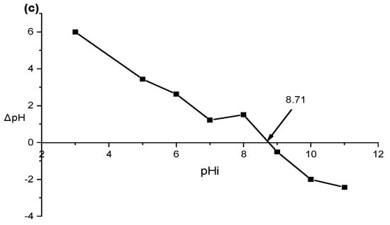Figure 5 depicts that augmenting the maximum adsorbent injection from 0.02 g to 0.05 g and decreasing the solution pH from 10 to 4 significantly augmented CV elimination efficacy from 61.82% to 99.86%. The greatest CV removal efficiency was achieved at pH 4, with a gradual decrease in dye removal as the pH value increased toward an alkaline environment. Furthermore, Figure 7 shows that the pHpzc of Kaol/Cel–25 was 8.71, establishing that the surface of Kaol/Cel–25 begins to be positively charged at pH values less than pHpzc. Conversely, at pH values above pHpzc, the surface charge of Kaol/Cel–25 becomes negative, which implies that Kaol/Cel–25 may adsorb cationic dyes. Consequently, more essential electrostatic attractions arise between the surface functional groups of negatively charged Kaol/Cel–25 and cationic CV dye, as shown in Equation (5).